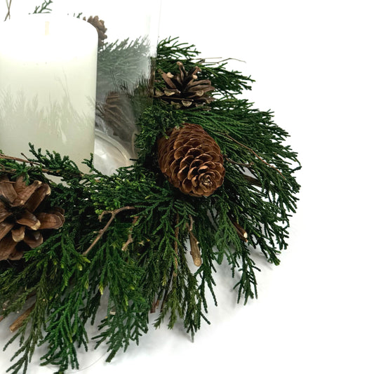 12" Small Preserved Pine Cone Candle Ring Wreath with Glass Candle Holder Christmas Centerpiece Set|Amber Ambience